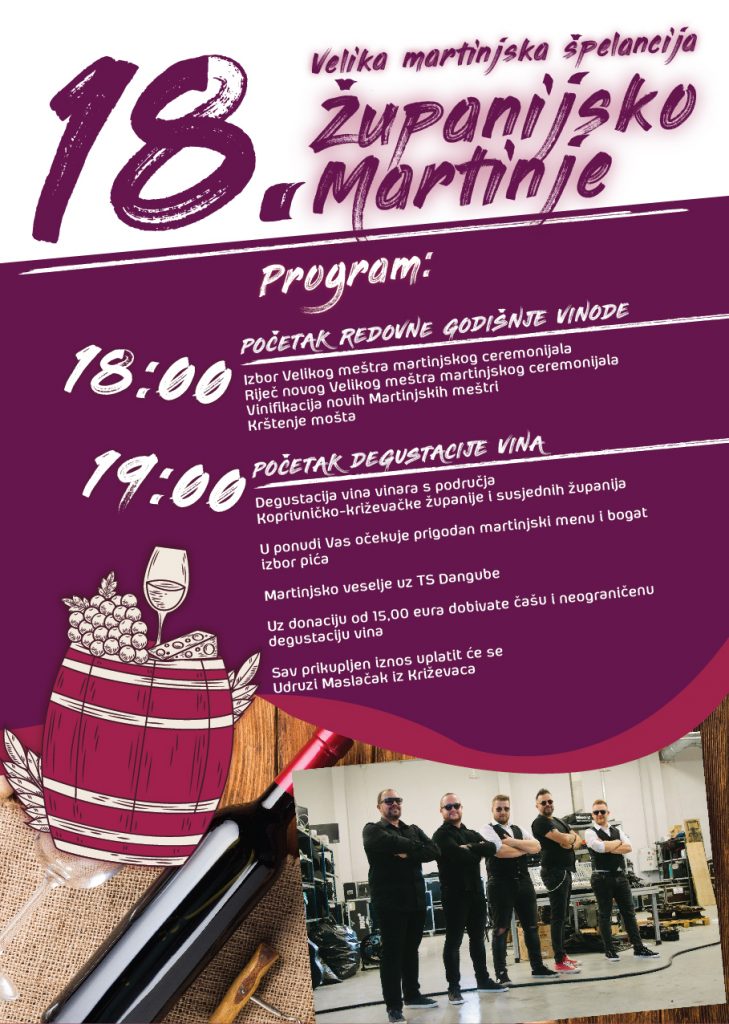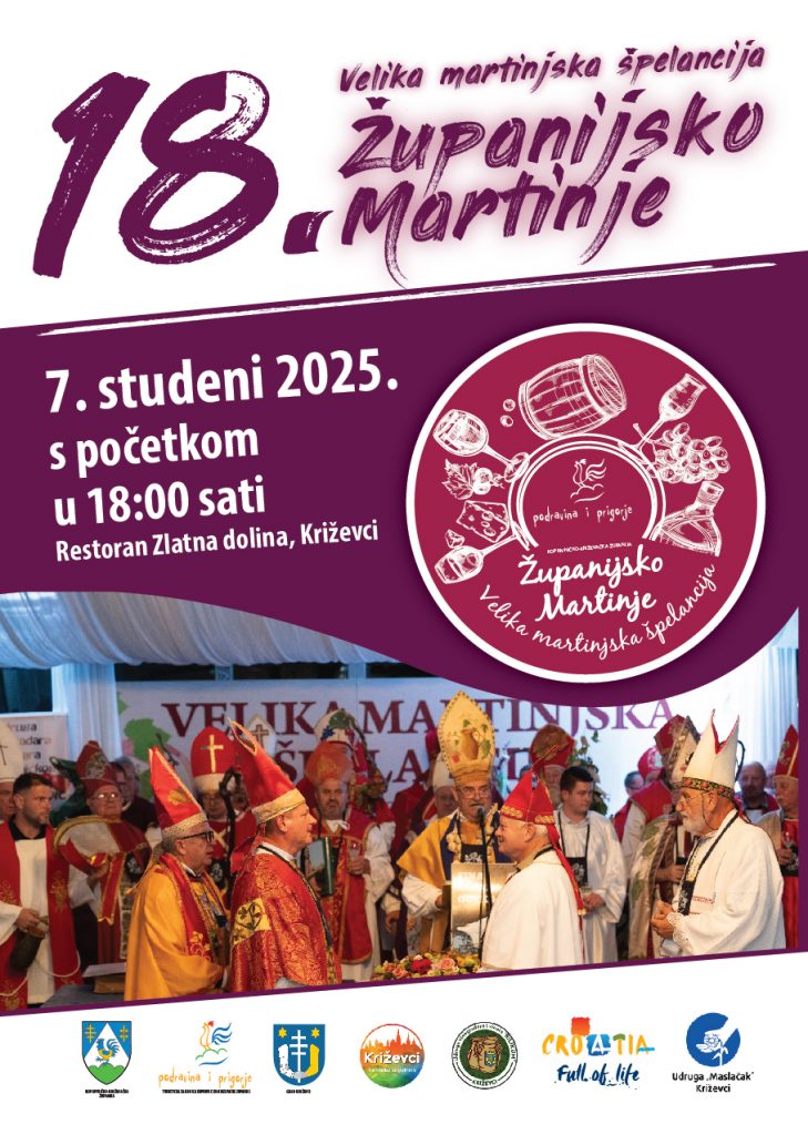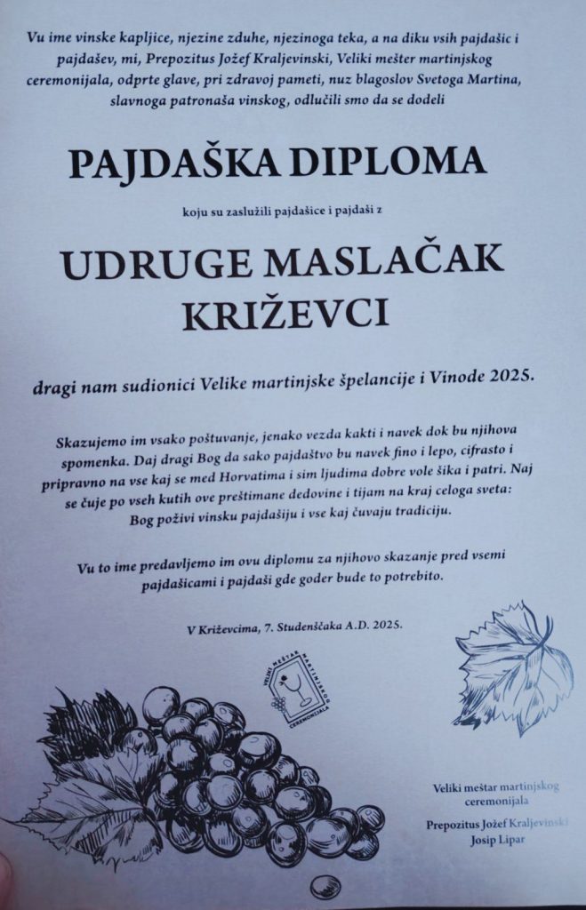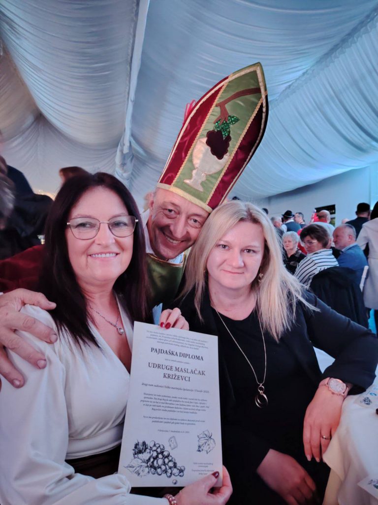 U organizaciji Turističke zajednice Koprivničko-križevačke županije u Križevcima, 7. studenoga 2025. je održana tradicionalna manifestacija 18. Velika martinjska špelancija – Županijsko Martinje koja je i ove godine okupila brojne vinske biskupe, vinare i ljubitelje dobre kapljice. Zamjenik župana Mario Rajn te gradonačelnik Tomislav Katanović istaknuli su važnost očuvanja vinske i turističke tradicije te ponos što se manifestacija održava upravo u Križevcima, gradu s bogatom vinskom tradicijom. Kao i prethodnih godina, manifestacija je imala humanitarni karakter, a prikupljeni iznos donirat će se Udruzi “Maslačak” Križevci. Našu udrugu je predstavila predsjednica Slađana Sekušak, a prisustvovale su i njena zamjenica Martina Benjak Brezjan kao i voditeljice Ivana Bratanić i Ivana Vukalović. Čestitke organizatorima i svima koji su doprinijeli da Martinje u Križevcima još jednom bude pravi spoj tradicije, vina i dobrog raspoloženja!