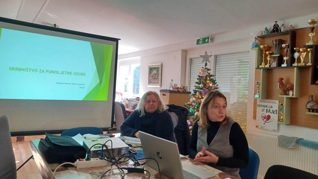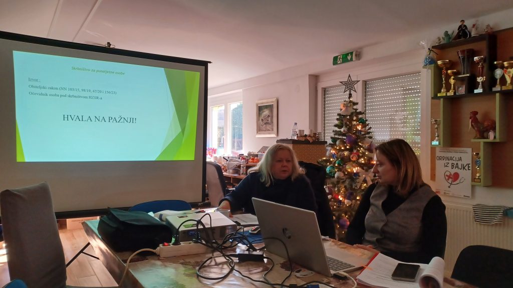 U četvrtak, 11. prosinca 2025. godine socijalne radnice Hrvatskoga zavoda za socijalni rad, Područnoga ureda Križevci Kristina Frtalić i Mirjana Matoić održale su predavanje roditeljima korisnika socijalnih usluga u Udruzi osoba s intelektualnim teškoćama i njihovih obitelji „Maslačak“ Križevci na temu skrbništva za punoljetne osobe te mentalnoga zdravlja.