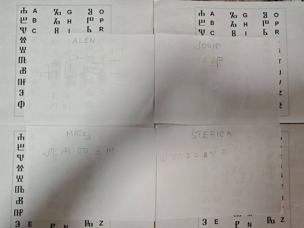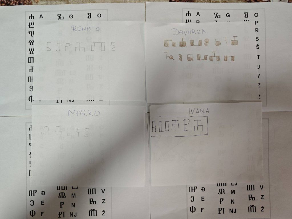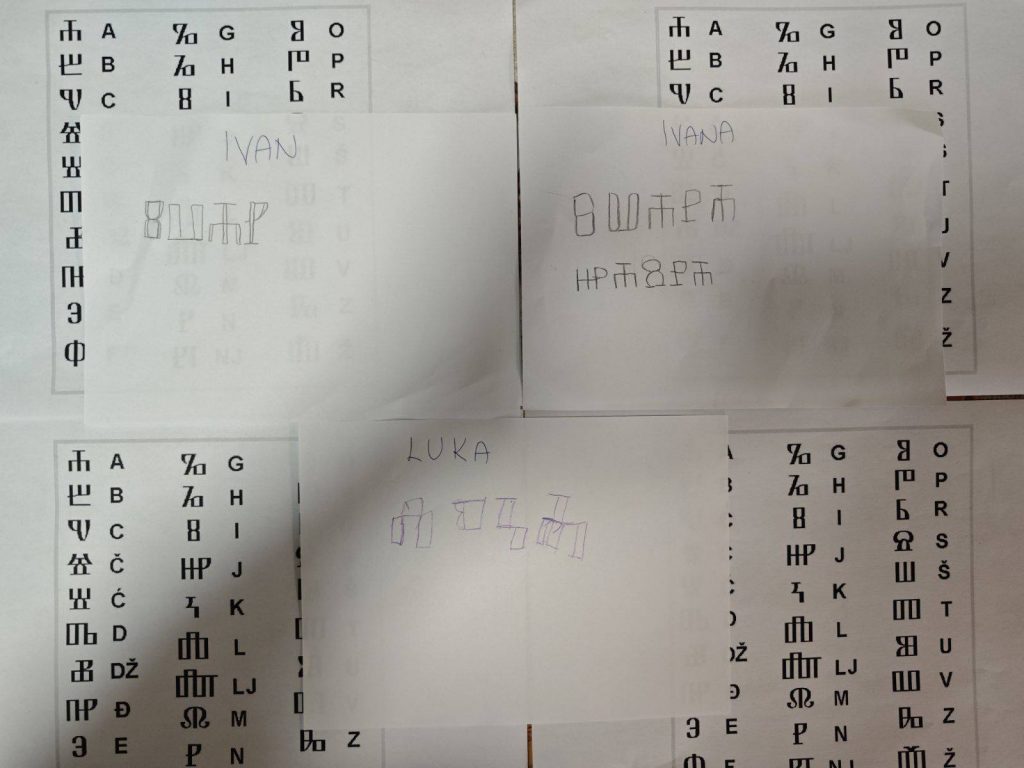 Danas smo obilježili Međunarodni dan materinskog jezika – dan koji nas podsjeća koliko je važno čuvati i njegovati svoj materinji jezik. Razgovarali smo o različitim jezicima svijeta, ali i o bogatstvu hrvatskih narječja – kako svako od njih nosi dio naše tradicije, identiteta i kulture. Posebno nam je bilo zanimljivo otkrivati stare načine pisanja, pa smo se okušali u pisanju vlastitih imena na glagoljici! Učeći o glagoljici prisjetili smo se koliko je bogata naša kulturna baština. Inspiraciju smo pronašli i u poznatom spomeniku hrvatske pismenosti – Bašćanska ploča, koji svjedoči o dugoj tradiciji hrvatskog jezika i pisma. Kroz druženje, razgovor i kreativni rad još smo jednom pokazali da je jezik most koji nas povezuje, omogućuje nam izražavanje osjećaja i jača naše zajedništvo.