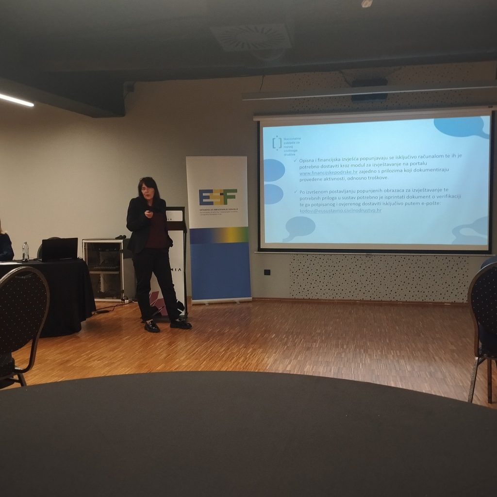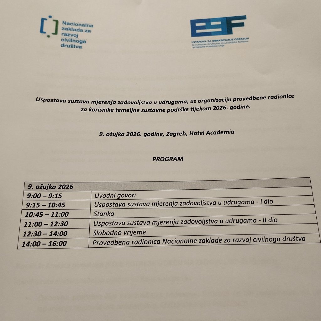 U ponedjeljak 09.03.2026. godine održana je izobrazba za korisnike temeljne sustavne podrške Nacionalne zaklade za razvoj civilnoga društva pod nazivom „Uspostava sustava mjerenja zadovoljstva u udrugama“, u organizaciji E.S.I.F. Ustanove za obrazovanje odraslih i Nacionalne zaklade za razvoj civilnoga društva, a ispred naše Udruge je sudjelovala zamjenica predsjednice Udruge Martina Benjak Brezjan, ujedno i zaposlena kao voditeljica rada i financijskog poslovanja Udruge, ali i socijalnih usluga.