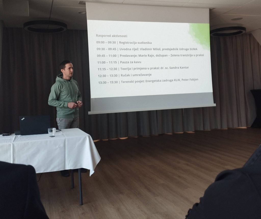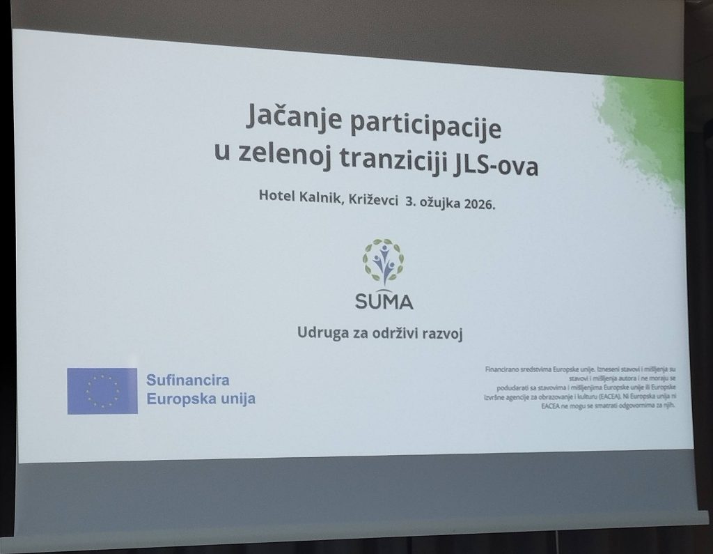 U utorak 03.03.2026. godine u organizaciji udruge za održivi razvoj SUMA iz Podravskih Sesveta u hotelu Kalnik u Križevcima održana je interaktivna edukacija pod nazivom ‘Zelena participacija’, a ispred naše Udruge je sudjelovala zamjenica predsjednice Udruge Martina Benjak Brezjan, ujedno i voditeljica rada i financijskog poslovanja Udruge. Edukacija je okupila više od 30 sudionika, uključujući brojne predstavnike općina iz Koprivničko-križevačke, Varaždinske i Virovitičko podravske županije, predstavnike razvojnih agencija, obrazovnih institucija te predstavnike civilnog sektora i mladih iz redova vijeća učenika i savjeta mladih. Program je otvorio Vladimir Miloš, predsjednik udruge SUMA i koordinator za razvoj, koji je uvodno predstavio rad udruge te otvorio ključna pitanja o trenutačnom stanju i izazovima u sektoru zelene tranzicije. Zelena tranzicija više nije samo ekološko pitanje, već ključni uvjet za povlačenje sredstava iz EU fondova u tekućem financijskom razdoblju, istaknuli su iz udruge SUMA. Središnji dio jutarnjeg programa obilježilo je predavanje koprivničko-križevačkog dožupana Marija Rajna na temu ‘Zelena tranzicija u praksi’. Izlaganje je održala i dr. sc. Sandra Kantar, koja se fokusirala na teoriju i primjenu zelene tranzicije u praksi. Poseban naglasak stavljen je na teme ekološkog otiska kao alata za mjerenje utjecaja zajednice, Turnaround Money – istraživanja o zelenom financiranju i načinima na koje lokalni novac može potaknuti tranziciju u Križevcima, ekološkog ponašanja stanovnika na primjeru lokalnih podataka koji najbolje rezoniraju s publikom te ulogu Veleučilišta u Križevcima (VUK) i njihov akcijski plan za poljoprivredu koji stoji na usluzi jedinicama lokalne samouprave. Poslijepodnevni dio programa bio je rezerviran za terenski posjet energetskoj zadruzi KLIK. Sudionike su s radom prve energetske zadruge u Hrvatskoj upoznali upravitelj zadruge Hrvoje Seleš i voditelji projekata Peter Fabjan i Martina Nemčić, pruživši im izravan uvid u uspješan model građanskog sudjelovanja u energetskoj tranziciji. Događaj je održan u okviru programa ‘Jačanje participacije u zelenoj tranziciji JLS-ova’ koji SUMA provodi u okviru decentraliziranog CERV programa Impact4values.