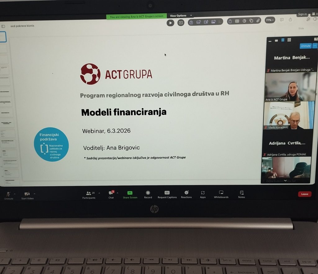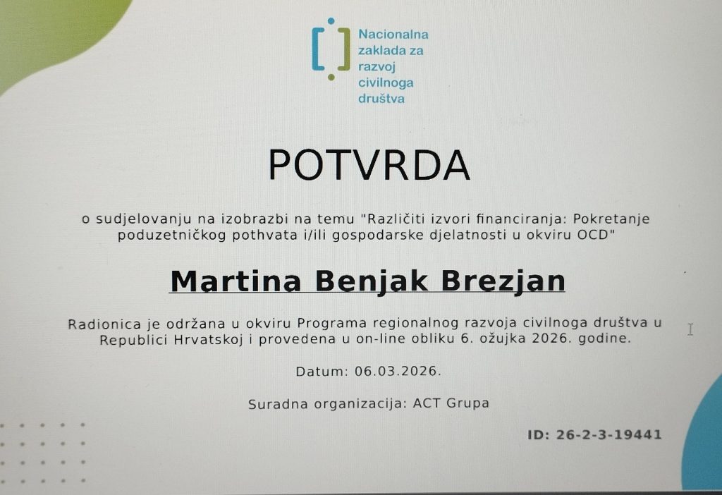 Dana 06.03.2026. godine je održan webinar koji je polaznike uveo u razvoj poduzetničkog pristupa unutar organizacija civilnog društva, a ispred naše Udruge sudjelovala je Martina Benjak Brezjan, zamjenica predsjednice Udruge. Sudionici su imali mogućnost analizirati pokretanja gospodarske djelatnosti ili društvenog poduzeća kao modela samoodrživosti. Fokus je bio na razumijevanju tržišnih potreba, definiranju ponude organizacije te oblikovanju poslovnog modela koji kombinira društveni učinak i financijsku održivost. Polaznici su identificirali vlastite resurse, znanja i potencijalne proizvode ili usluge koje mogu ponuditi tržištu. Razvijali su osnovne poduzetničke vještine, uključujući definiranje ciljanog tržišta i izradu jednostavnog poslovnog modela. Cilj je bio osnažiti organizacije da prepoznaju mogućnosti diverzifikacije prihoda i dugoročne stabilnosti. Voditeljica je bila Ana Brigović iz ACT grupe d.o.o.
