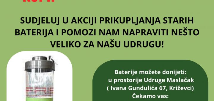 Dragi prijatelji,krenula je naša akcija sakupljanja starih baterija pod logom “Baterije skupi-Maslačcima hladnjak kupi”.Baterije možete donijeti od ponedjeljka do petaka u vremenu 07:00-15:00 sati u našu Udrugu u Ulici Ivana Gundulića 67, Križevci.Ako su...